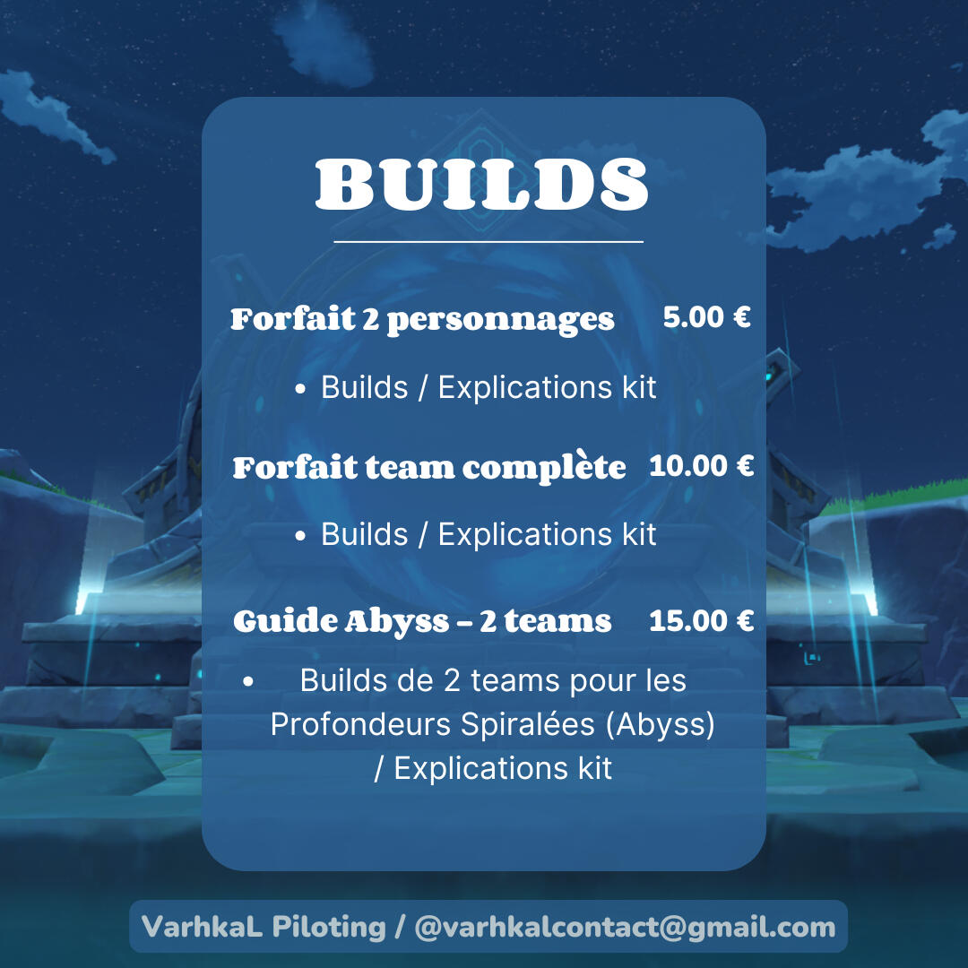 → Concernant le build des personnages et le guide des Profondeurs Spiralées, toutes discussions se feront via Discord ou Instagram. Je créerai des guides écrits personnalisés afin que vous puissiez les lire quand vous le souhaitez tout en restant disponible pour répondre à vos questions !