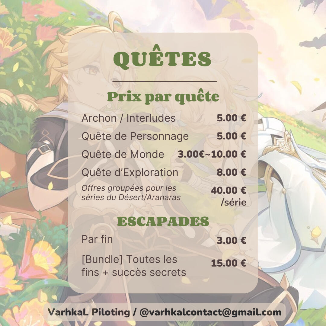 → Merci de faire attention aux prérequis du Niveau d'Aventure (AR) concernant la complétion des quêtes. Assurez vous de débloquer les quêtes/escapades avant ; Je ne pourrai pas faire les quêtes demandées si vous manquez de clefs, si je dois les obtenir moi-même des frais additionnels seront comptés.